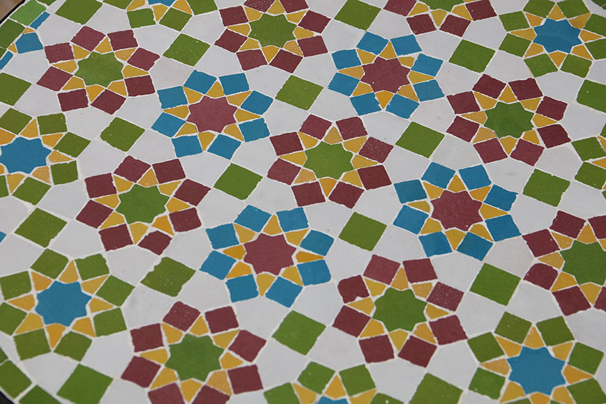 The word zellij comes from the root Arabic word زَلَجَ, meaning “to slide”, referring to the smooth glazed surface of the tiles. Amazingly, at times, the intended shape is not created simply by chipping away at the clay bricks to form it, but instead by chiseling other precise shapes that when fit together, form the shape so desired (image required for illustration purposes). There are an infinite number of combinations of geometric shapes, many of which have been memorised by heart by the craftsmen who have been continuing and preserving this trade for centuries. Squares, triangles, diamonds, stars, polygons and crosses are made to fit perfectly and precisely to form orderly mosaic patterns. However ornamental in nature, zellij stresses the importance of unity, order and logic, which not-so-coincidentally are key teachings of Islam.